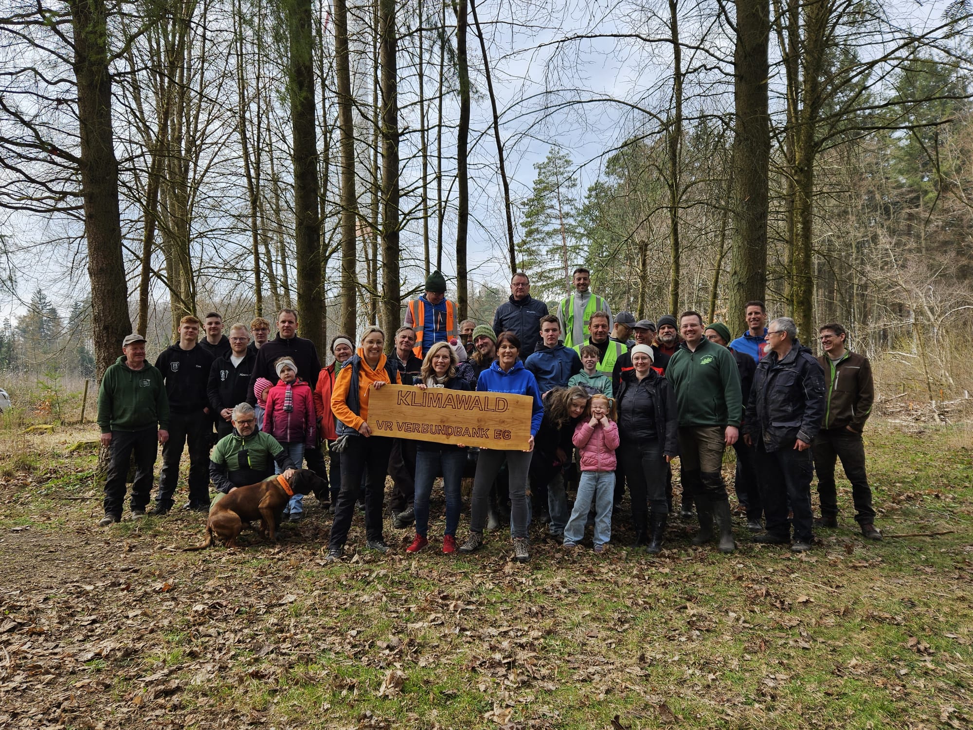 Der klimafairein hatte dafür über die verschiedensten Kanäle zusätzliche Helferinnen und Helfer gewinnen können, auch Bürgermeister Christoph Lück hat bei der Werbung für die Aktion kräftig unterstützt: „Wir konnten uns über fünfzig bis sechzig Helfende freuen“, sagt Dr. Thorsten Reichel (1. Vorsitzender des klimafaireins), der die Leitung der Aktion vor Ort hatte. Als Vertrerer:innen der VR Verbundbank waren Daniela Schamari und Kerstin Novy mit dabei: „Wir unterstützen den klimafairein seit vielen Jahren und freuen uns sehr, auch die heutige Aktion mit 5000 Euro finanziert zu haben“, so Schamari. Kerstin Novy ergänzt: „Uns als der Region verbundes Institut ist es wichtig, vor Ort aktiv zu wirken. Zum einen, weil es wichtig für das Klima und den Umweltschutz ist, zum anderen macht es auch sehr viel Spaß.“ Dass dann am Ende der Aktion noch ein großes Schild mit „KLIMAWALD VR Verbundbank eG“ auf dem frisch bepflanzten Waldstück platziert wurde, zeigt einmal mehr Freude, Verbundenheit und auch Verantwortung.