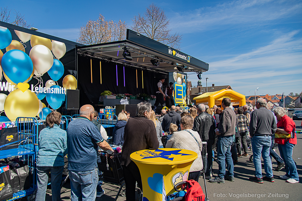 Um 13.00 Uhr herrschte auf dem Parkplatz vor dem Eingang des Marktes großer Andrang. Zahlreiche Besucherinnen und Besucher versammelten sich rund um den EDEKA-Truck, der als kleine Imitation eines Wochenmarktes gestaltet war.