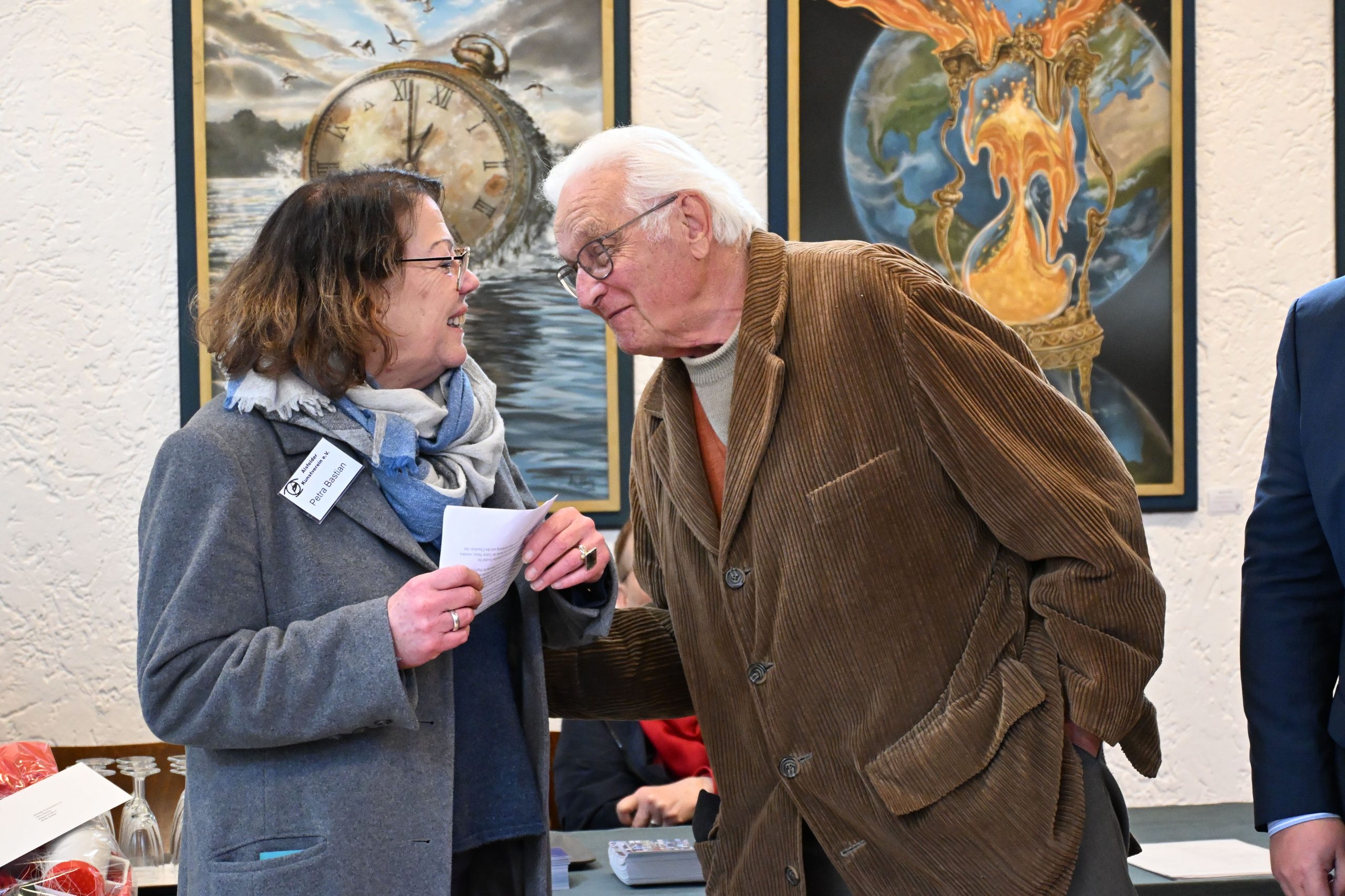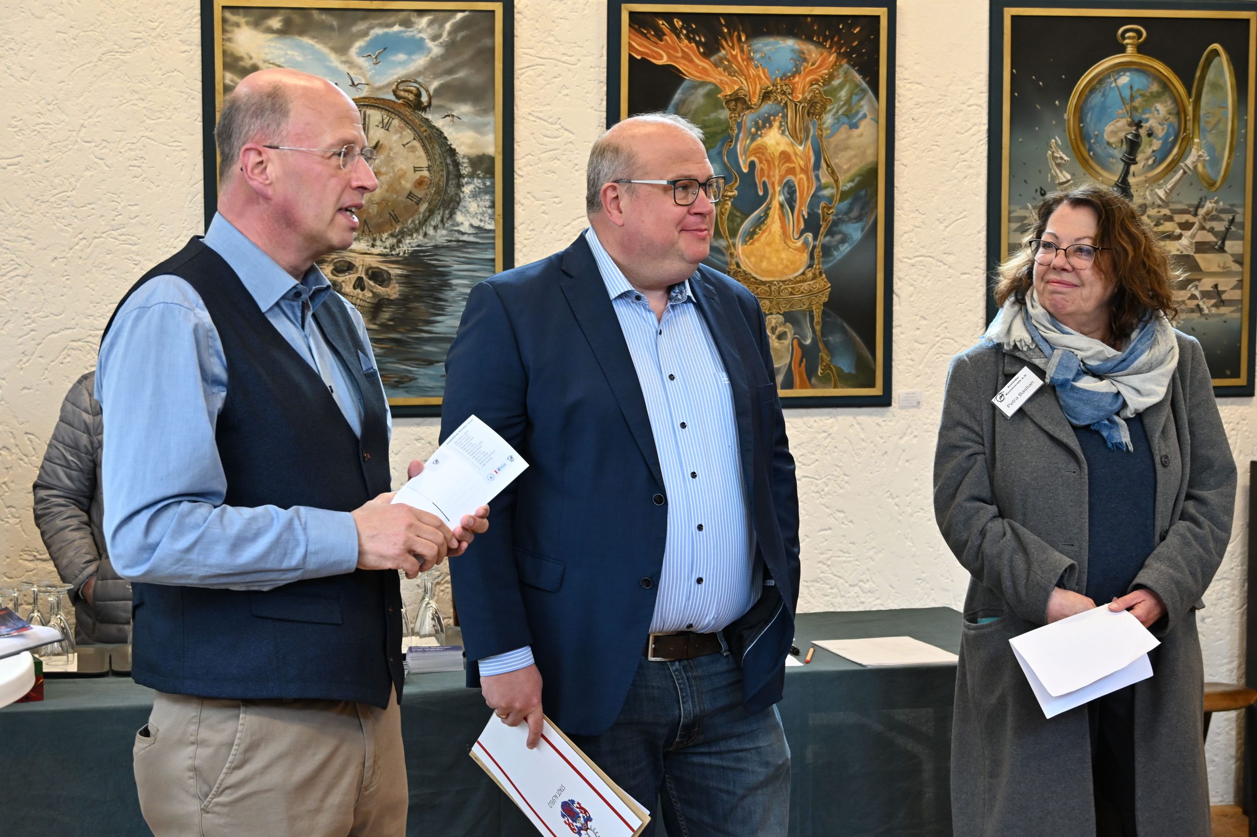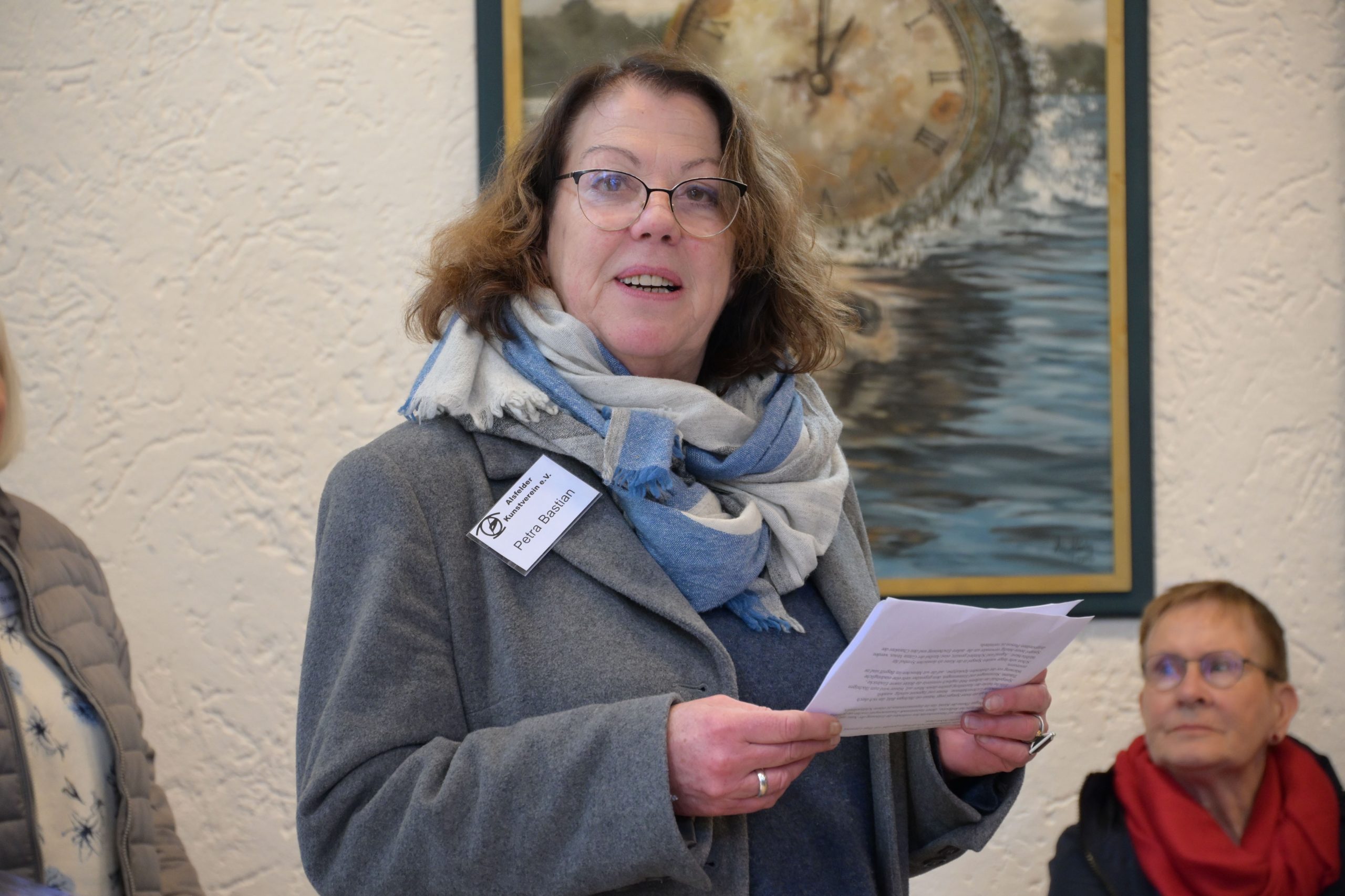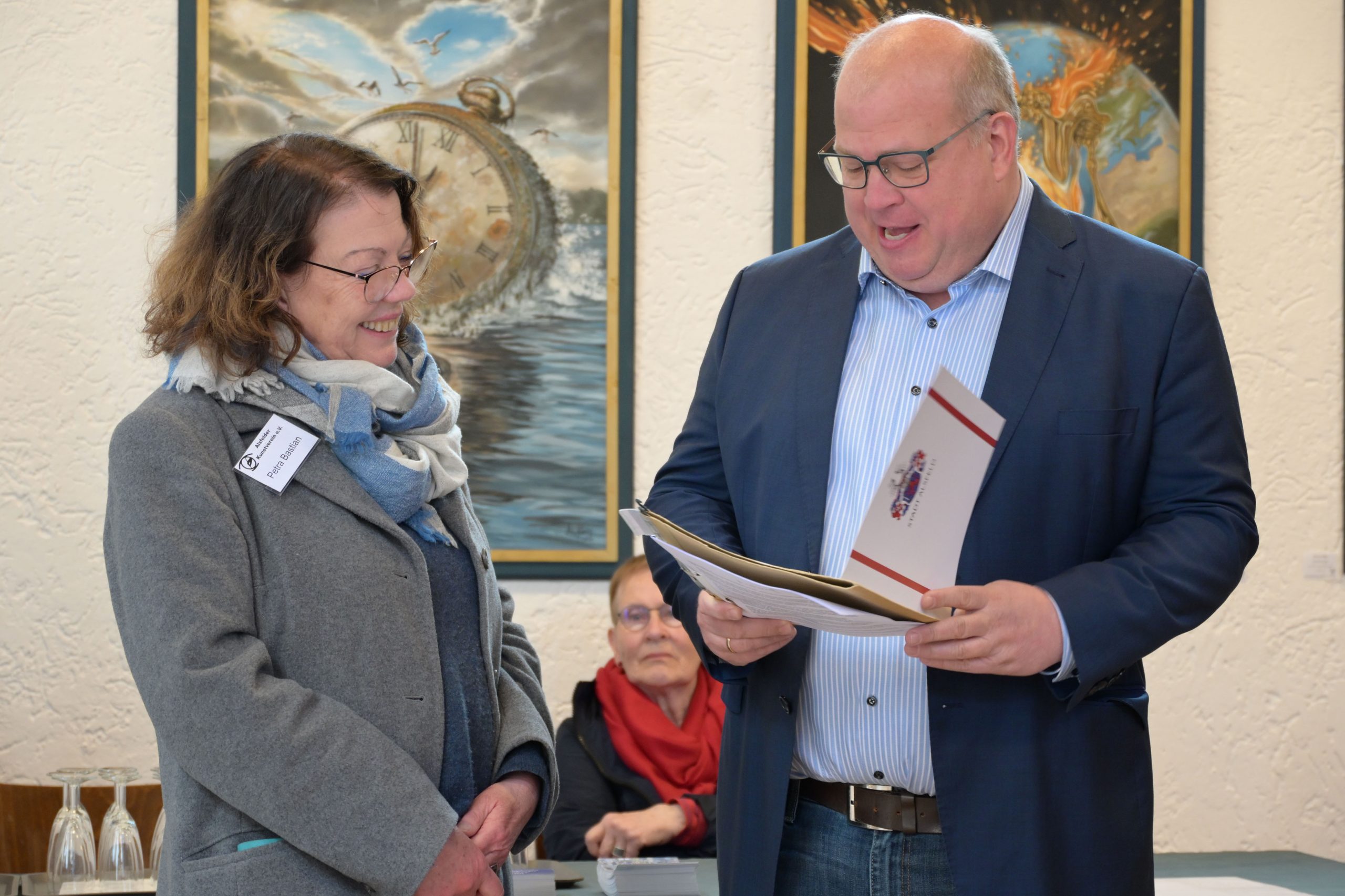 Paule nutzte die Vernissage auch, um das Wort direkt an Petra Bastian zu wenden. Sie hat vor zehn Jahren den Vereinsvorsitz von dem heutigen Ehrenvorsitzenden Erich Späth – der im Übrigen auch anwesend war – übernommen. Für ihren seither sehr zuverlässigen und engagierten Einsatz für die Kultur der Stadt überreichte der Bürgermeister ihr die bronzene Anstecknadel der Stadt Alsfeld, verbunden mit einer Urkunde und einem Geschenk.