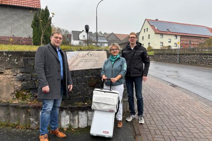 Mit ihrer mobilen Praxis bietet Susan Jirse aus Schwarz seit Kurzem professionelle Fußpflege direkt bei ihren Kundinnen und Kunden zu Hause an. Das umfangreiche Angebot reicht von klassischer Pflege über Spangentechnik und Prothetik bis hin zu präventiven Behandlungen für Diabetikerinnen und Diabetiker. Zur offiziellen Betriebsaufnahme gratulierten Ortsvorsteher Matthias Muhl und Grebenaus Bürgermeister Lars Wicke.