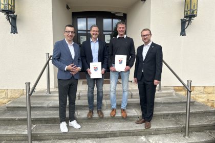 Im Rahmen einer Feierstunde gratulierten Landrat Dr. Jens Mischak und Erster Kreisbeigeordneter Patrick Krug den langjährigen Mitarbeitern Stefan Jost und Tobias Lippert zu ihrem 25-jährigen Dienstjubiläum. Beide sind seit dem Jahr 2000 in der Kreisverwaltung tätig und prägen mit Fachwissen, Teamgeist und großem Engagement ihre jeweiligen Bereiche. Neben der Behördenleitung schlossen sich zahlreiche Kolleginnen und Kollegen den Glückwünschen an.