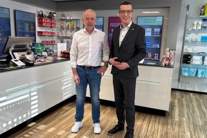 Patrick Krug informiert sich bei Apotheker Dr. Christian Gerninghaus über Herausforderungen vor OrtApotheken als wichtiger Baustein der Gesundheitsversorgung
